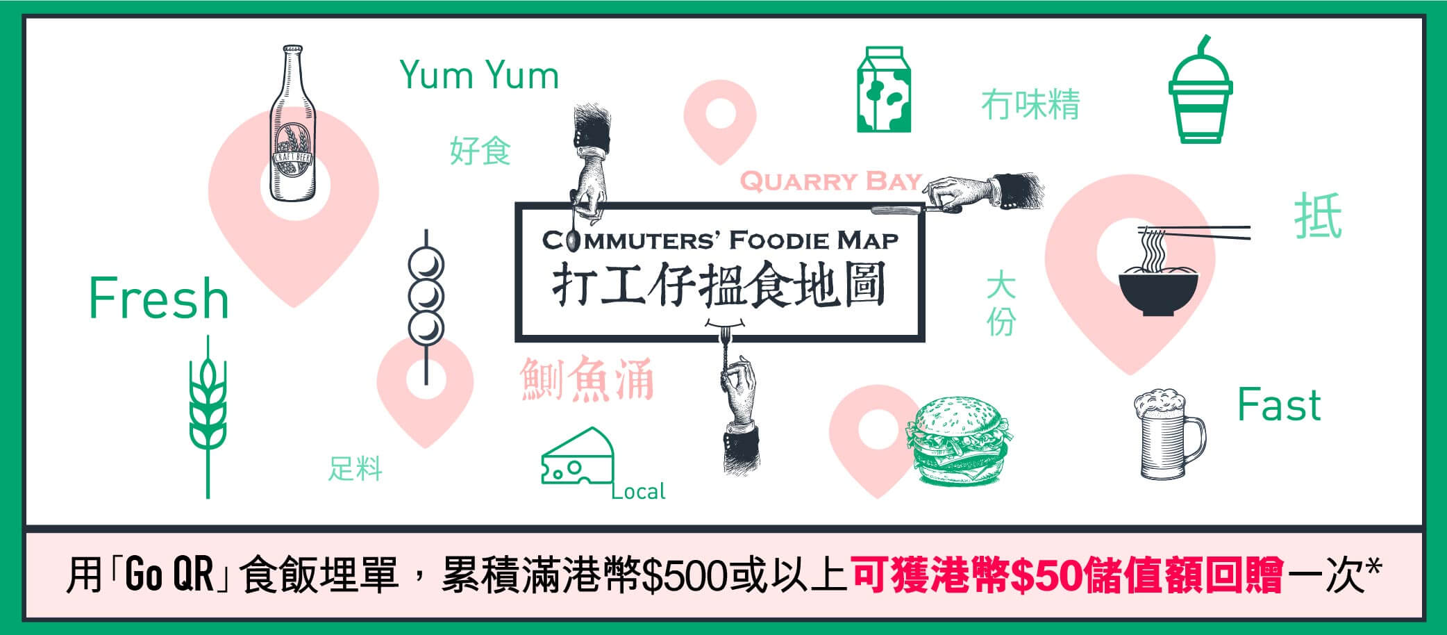 由2018年3月23日至2018年5月23日,用「Go QR」付款方法於指定餐廳商戶合共累積消費最少港幣$500,可獲港幣$50儲值額回贈。除咗回贈,指定貨品仲有9折優惠添!