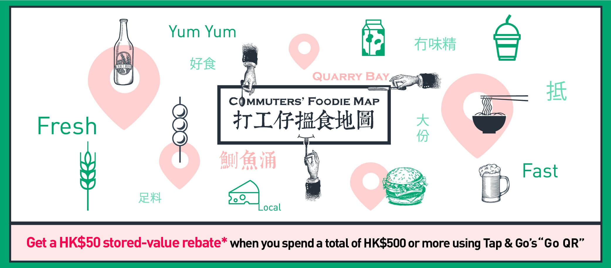 - This Rebate is applicable to the customers (“Customers”) of Tap & Go Payment Service (“Tap & Go”) who spend an aggregated amount of at least HK$500 (“Aggregated Spending”) using the “Go QR” payment method via Tap & Go during the Promotion Period at the selected restaurants (“Merchants”). For details of the Merchants, please visit www.tapngo.com.hk/eng/foodiemap.html.