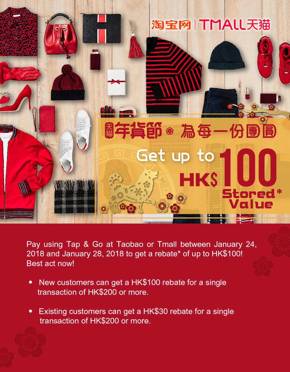 – This HK$100 Rebate is applicable to the first 3,000 new customers (“Qualified New Customers”) who successfully activate Tap & Go Payment Service (“Tap & Go”) and upload a copy of a valid identity document for the first time during the Promotion Period. Qualified New Customers will receive this HK$100 Rebate if they settle payment with Tap & Go upon a single net purchase of HK$200 or above at Taobao® Marketplace (world.taobao.com), Tmall Global (www.tmall.hk) or Tmall (www.tmall.com) (collectively, the “Platforms”) from 24 January 2018 to 28 January 2018 (“Shopping Carnival”). Each Qualified New Customer (counted by valid identity document number) can enjoy this HK$100 Rebate once only.