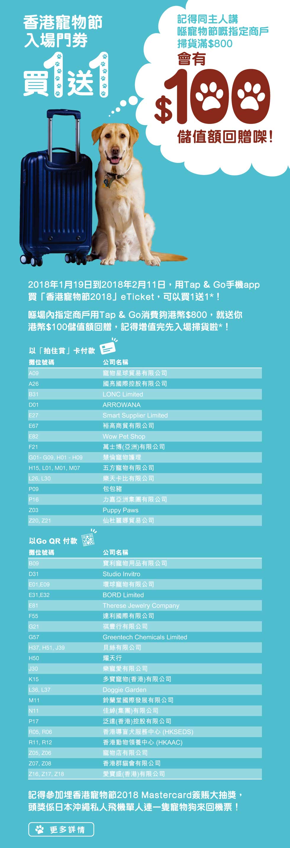 - 主辦機構負責此門票之安排。如欲了解活動詳情,請瀏覽www.petshow.com.hk。HKT Payment Limited (「 HKT Payment 」)負責拍住賞。拍住賞受相關條款及細則約束。如對拍住賞有任何疑問,詳情請瀏覽拍住賞網站www.tapngo.com.hk或致電拍住賞服務熱線2888 0000。