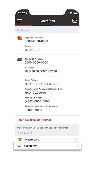 Step 2: Find your Tap & Go UnionPay or Mastercard i.Card details.